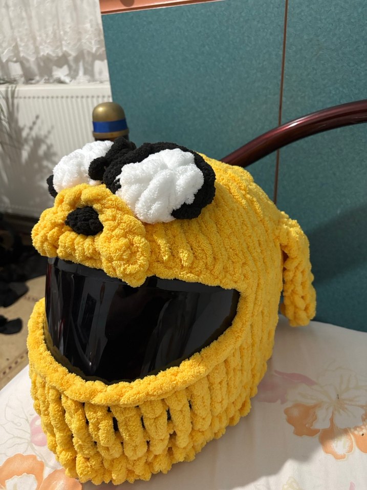 Sarı örgü kumaşla kaplı motosiklet kaskı, çizgi film köpek desenli ve renkli avant-garde tarzda tasarlanmıştır.