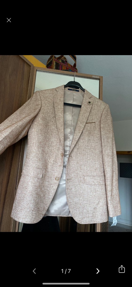 Bej erkek ceket, düğmeli ve notch yaka detaylıdır. Uzun kollu, klasik şıklık ve parlak kumaşıyla ofis kullanımı için uygundur.