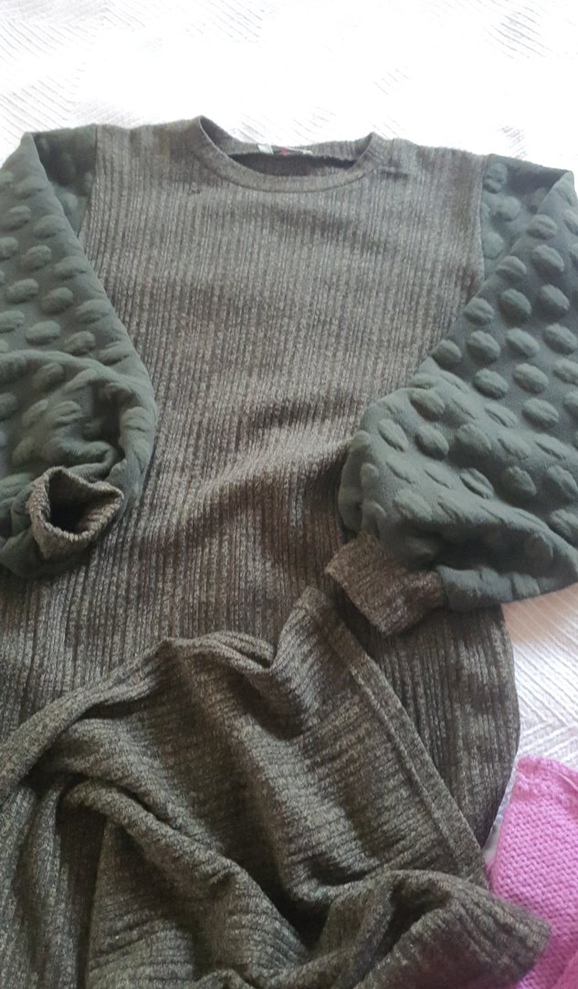 haki balon kol ince triko elbise renk odta elbise kusm8 daha koyudur