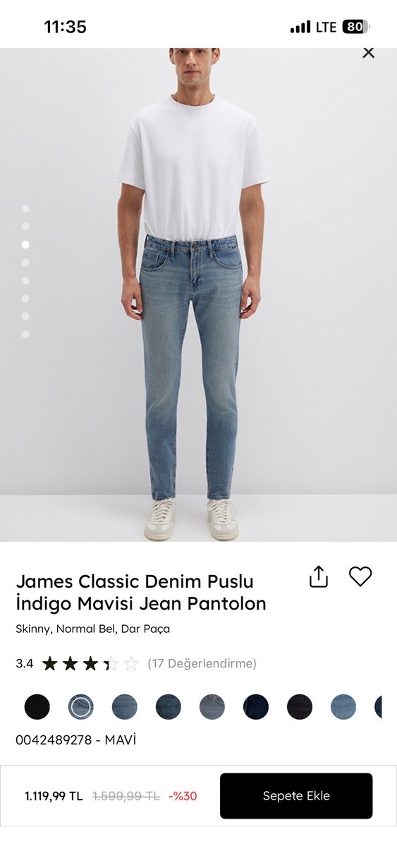 James Classic Denim puslu indigo mavisi jean pantolon, skinny kesim, normal bel ve dar paça ile rahat bir tasarıma sahiptir. Günlük kullanıma uygundur.