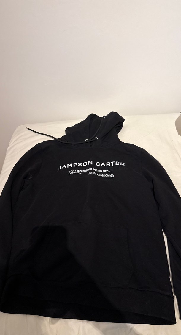 Jameson Carter siyah kapüşonlu sweatshirt, baskılı ve bol kesimdir. Uzun kollu, fermuarlı ve yumuşak kumaştan üretilmiştir.