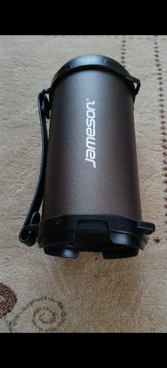 Jameson markalı siyah ve gri Bluetooth hoparlör, taşınabilirlik için taşıma kayışı ve silindirik tasarıma sahiptir.