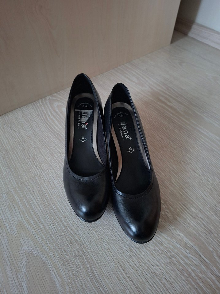 Jana markalı, kauçuk malzemeden yapılmış, tokalı, blok topuklu siyah klasik kadın ayakkabısı, iş ortamına uygundur.