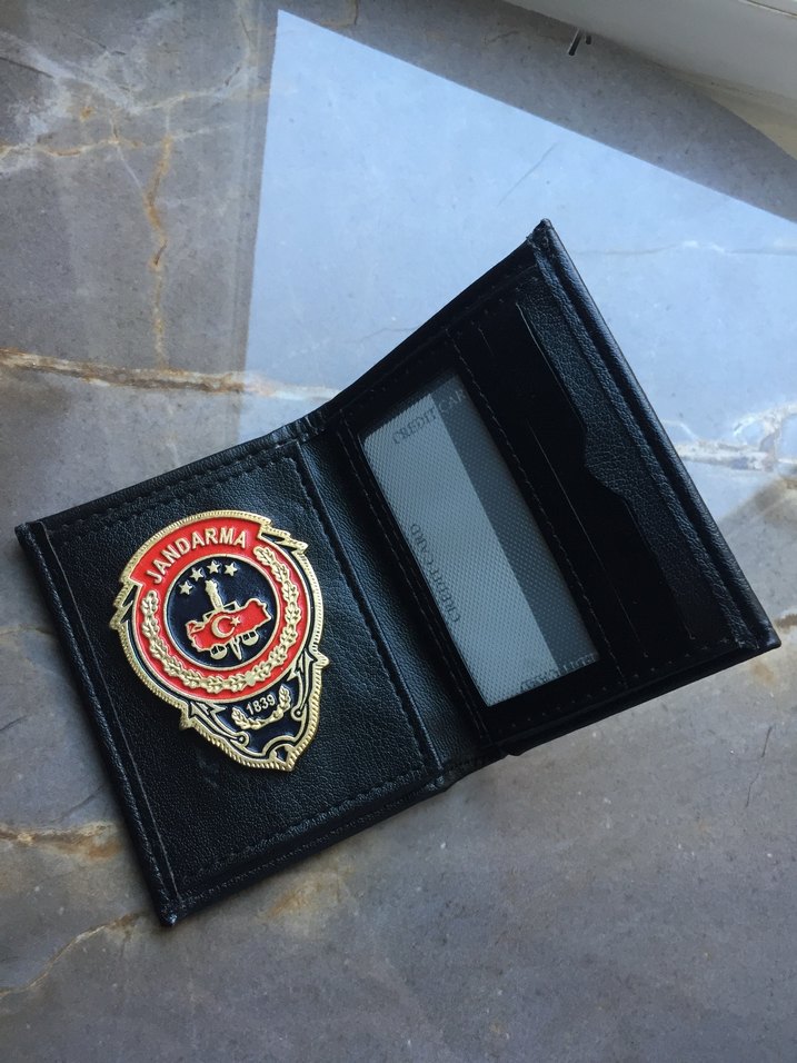 Koyu renkli erkek deri cüzdan, üzerinde altın renkli Jandarma baskılı amblem ve kart bölmeleri bulunur.
