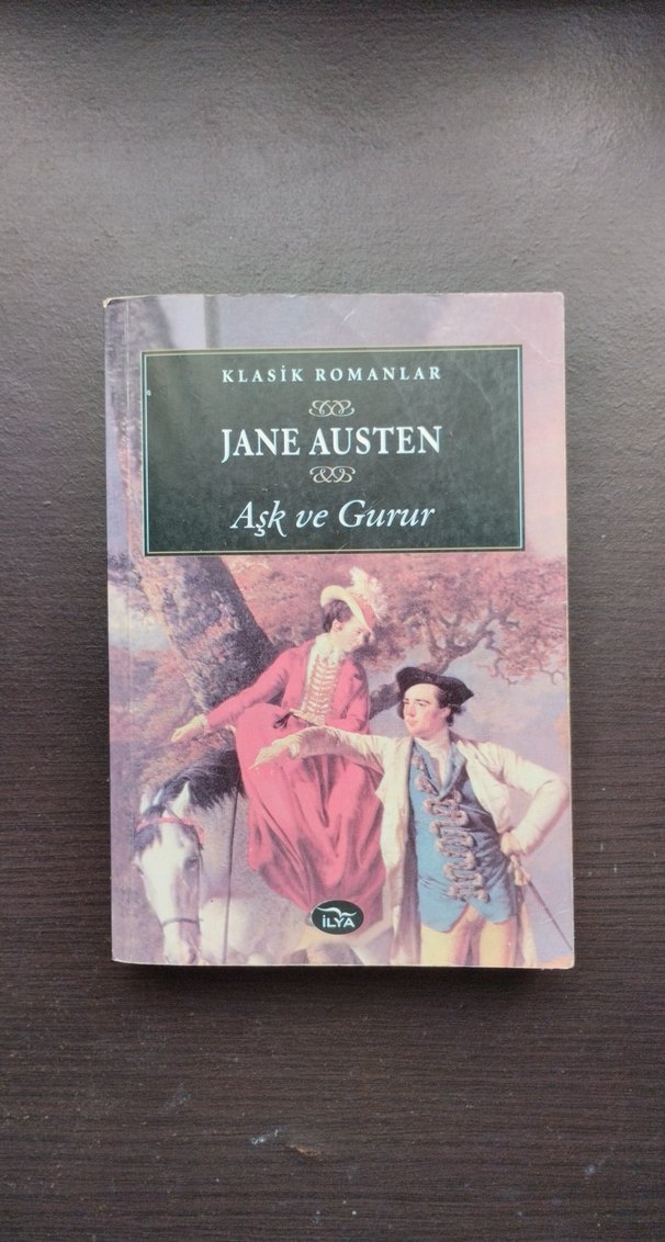 Jane Austen'ın klasik romanı 'Aşk ve Gurur'. Kapakta döneme ait giysiler giymiş bir adam ve kadın ile at resmi yer alıyor.