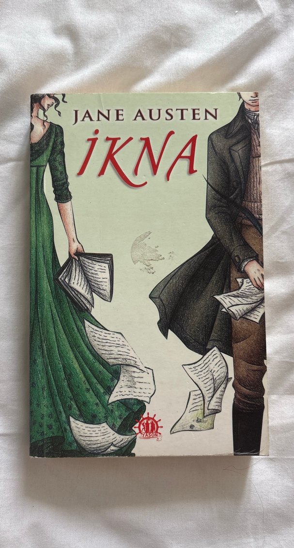 Jane Austen'ın "İkna" adlı romanının Türkçe baskısı. Kapakta çizim karakterler ve uçuşan kağıtlar yer alıyor.