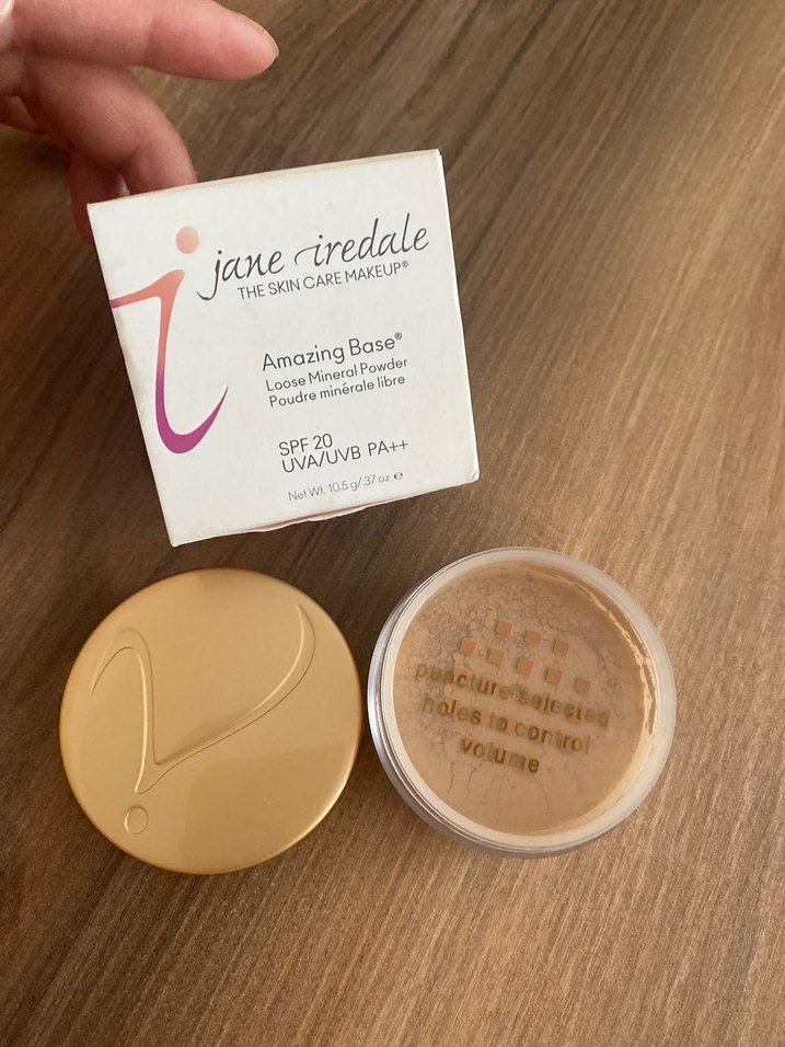 Jane Iredale Amazing Base gevşek mineral pudra, parlak bej renkte, SPF20 koruma ve UVA/UVB PA++ filtresi sunar. Hacim kontrolü ve doğal bitiş sağlar. ✨
