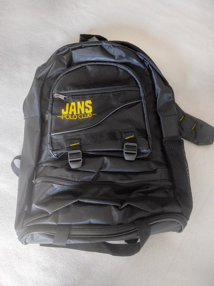 JANS Polo Club baskılı, fermuarlı siyah sırt çantası. Çoklu cepleri ve yan file tutucusu ile sokak stiline uygun bir model.
