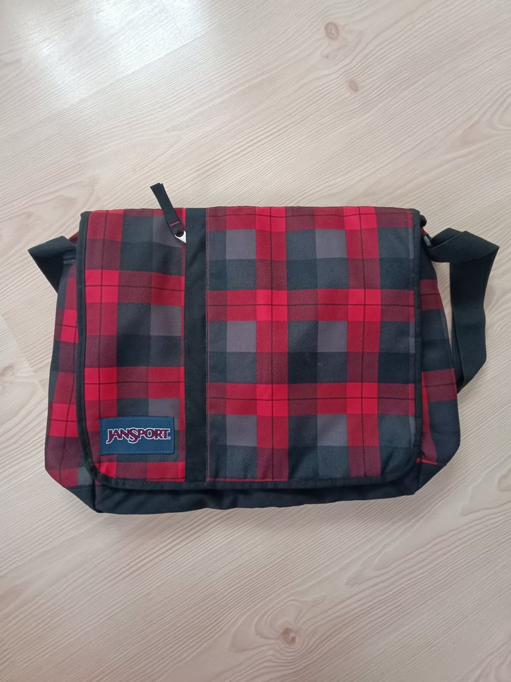JanSport markalı erkek postacı çantası, kırmızı-siyah kareli baskılı desen. hic kullanılmadı. ic kısımda bir boya hatası var resimledim. dıştan belli olan birşey değil.