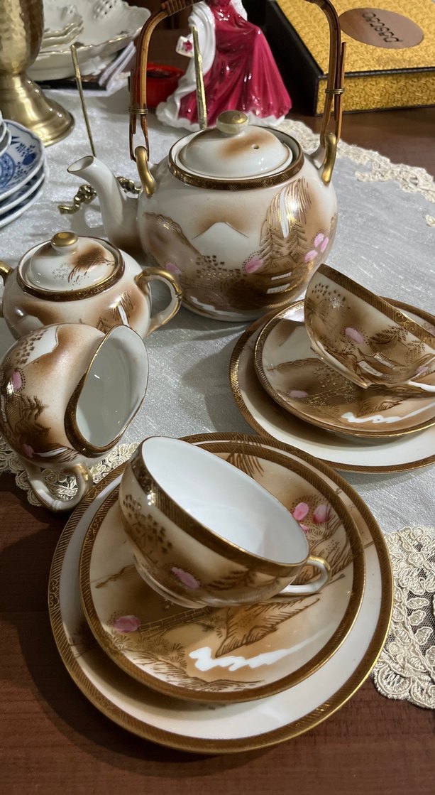 Pot,şekerlik ,sütlük ve 2 adet trio.Bej renkli porselen çay seti, pastel tonlarda el boyaması detaylar içerir. İçinde demlik, fincanlar ve tabaklar bulunur.