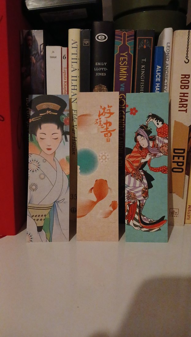 Geleneksel Japon sanatını yansıtan, zarif kadınlar ve koi balığı tasarımlı üçlü kitap ayracı seti. Kitaplarınızda kullanmak için ideal.