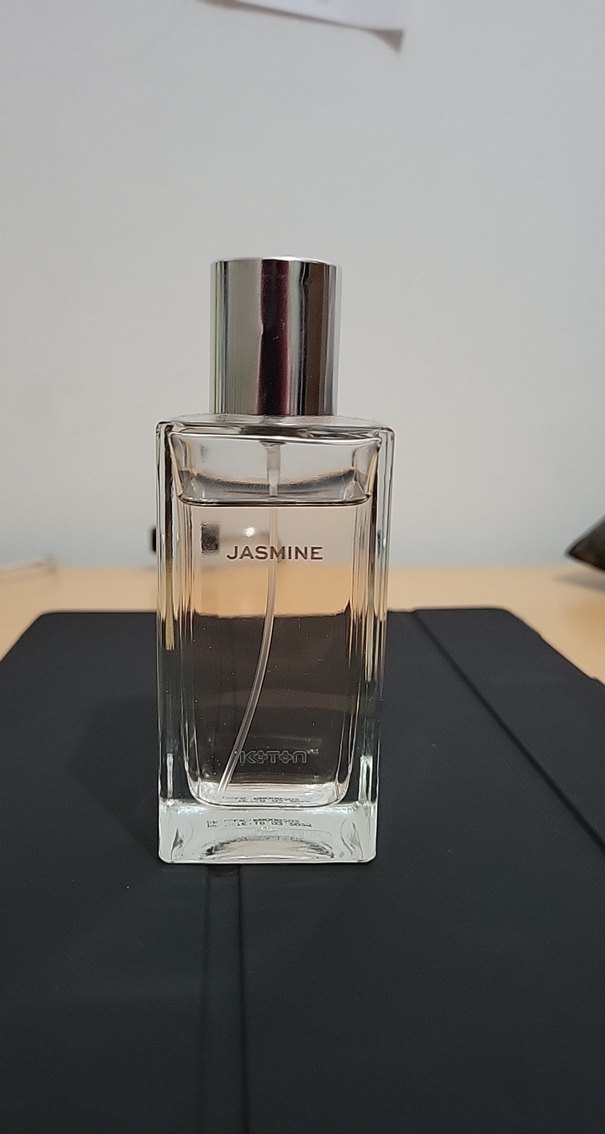 Jasmine kadın parfümü, gümüş kapaklı şeffaf cam şişede, ferah çiçeksi koku sunar.