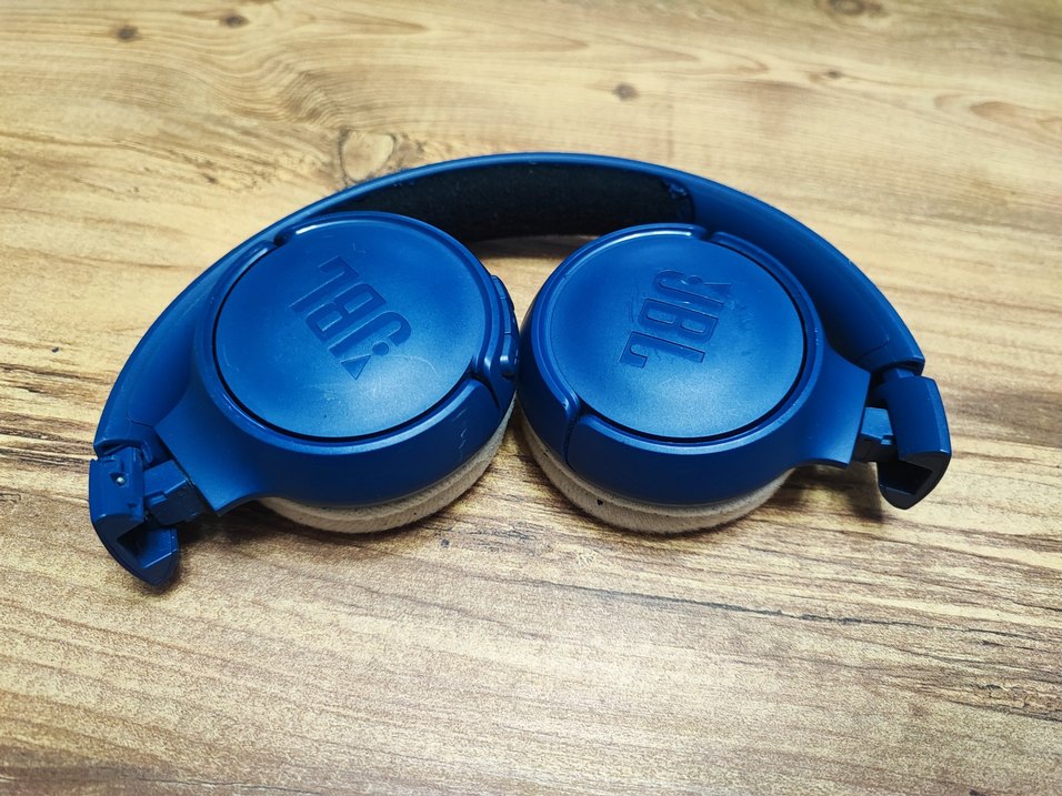 Konforlu yumuşak kulak pedleri ve ayarlanabilir bantlı mavi JBL kulaklık .