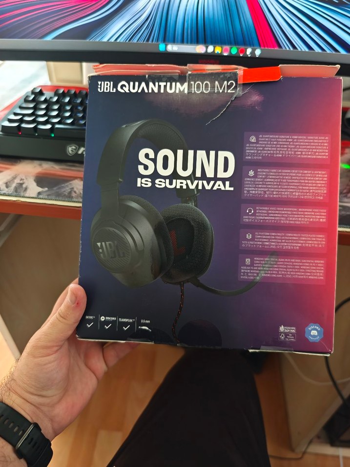 JBL Quantum 100 M2 siyah kulaklık, güçlü ses deneyimi ve "Sound is Survival" sloganıyla öne çıkar. Az Kullanılmış Orjinal Ürün KUTU HASARLI