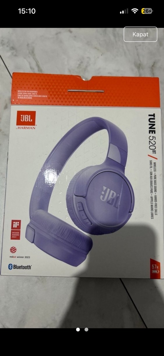 JBL Tune 520BT, Bluetooth bağlantılı ve 57 saate kadar pil ömrü sunan mor renkli kablosuz kulaklıklardır.