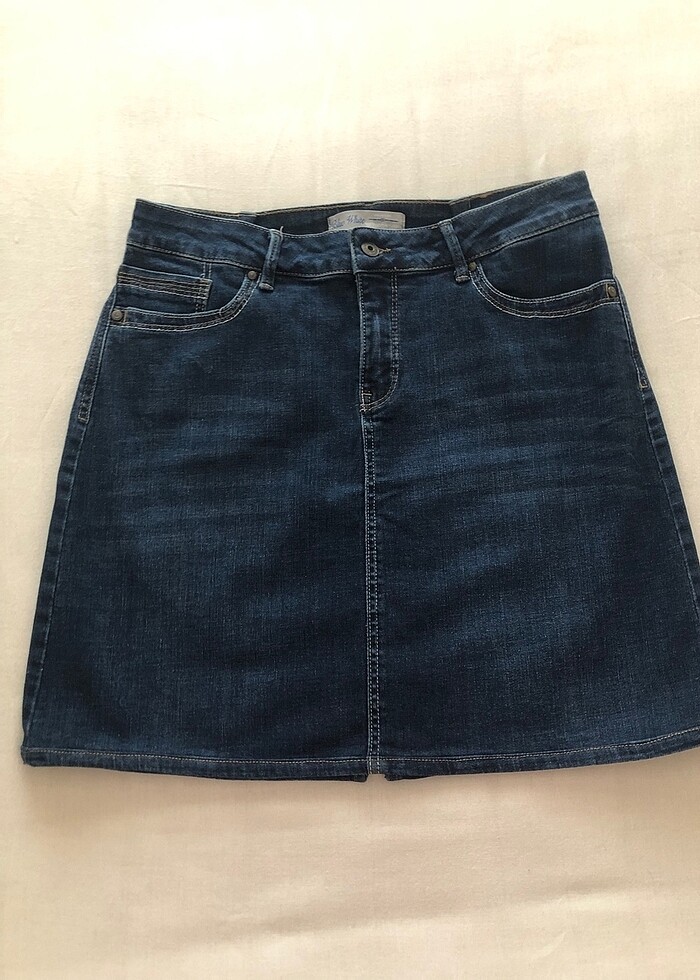 Jean etek ## BEL 40 cm Boy 48 cm ## MODEL A kesim modeli Rahat kalıp ## rahat esnek 40 42 beden uyumlu ## belden pens attırdım isteyen pensi sökebilir beden genişletmek isterse fakat hiç giymedim aldığım gibi duruyor yeni güzel bir üründür satış fiyatı 900 tl Bluewhite ürünüdür rahat kalıp