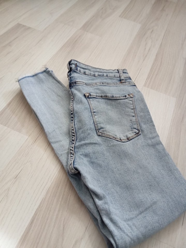 Mavi paçası püsküllü dar paça yüksek bel pantolon defosuz ürün.dar geldiği için satıyorum
