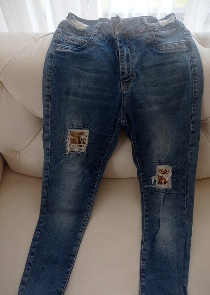Diz kisimlarda yırtık altından golt renkte pul yama var laciver Jean taslamali spor kladik sevenler için şık bir jean