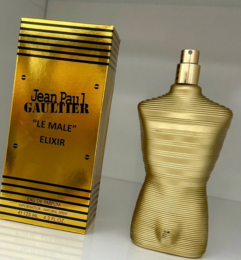Jean Paul Gaultier Le Male Elixir, parlak altın renkli ve erkek vücudu şeklinde tasarlanmış şişesiyle dikkat çeken, karşı kültür ve ışıltılı tarzda erkek parfümüdür.
