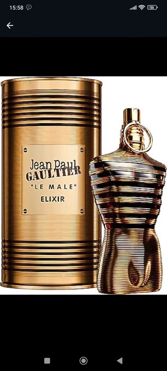 Jean Paul Gaultier Le Male Elixir, parlak altın renkli, benzersiz gövde şeklinde şişesiyle göz alıcı bir erkek parfümüdür. Cesur karşı kültür tarzını yansıtır.✨