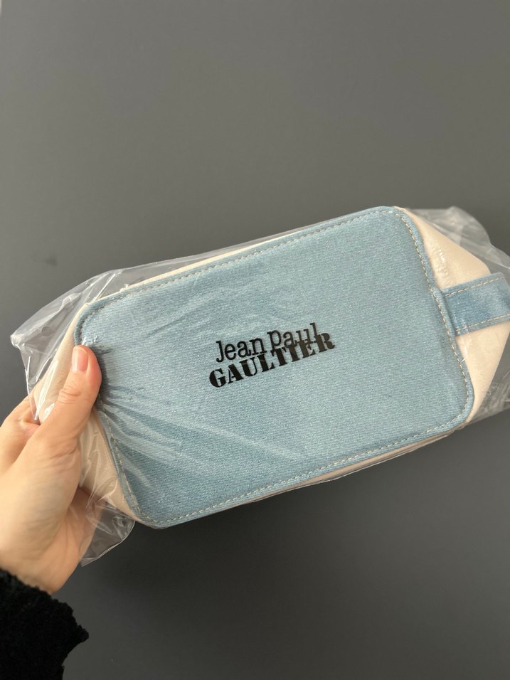 Jean Paul Gaultier marka, mavi denim bej kumaşlı makyaj çantası, fermuarlı ve baskılı logo detaylarıyla Paris tarzını yansıtıyor. Parfüm alırken hediye olarak verdiler ama kullanmayacam, ondan satıyorum. Ürün sıfır, sadece poşeti yırttım, bakmak için. #jeanpaulgaultier #jpgaultier #makyajçantası