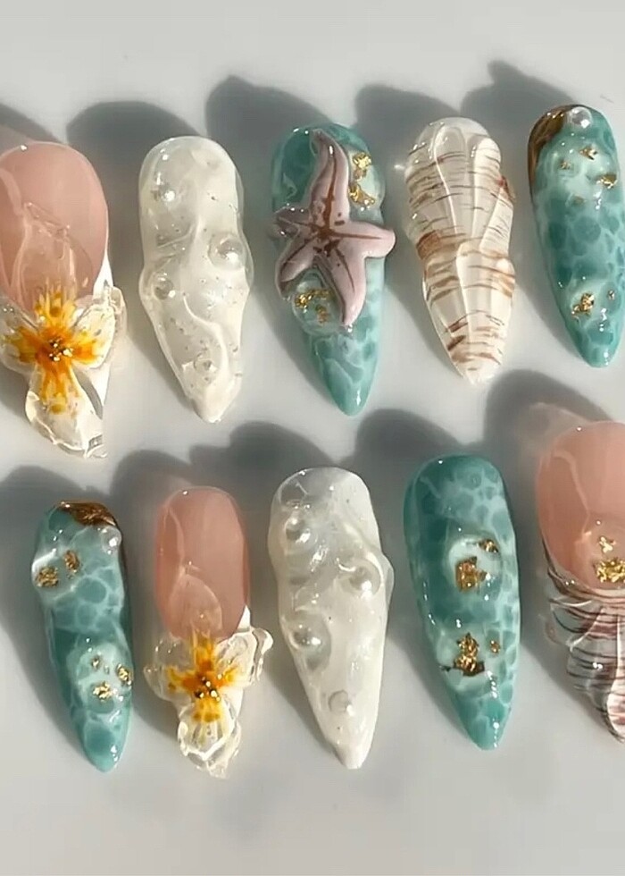 Kutulu şekilde gönderilecektir. El yapımı okyanus tasarımlı jel takma tırnak. XS ve S bedenleri mevcuttur. Setin içerisinde 10 adet tırnak, 1 adet törpü, 1 adet düzeltme çubuğu, 24 adet yapışkan mevcuttur .