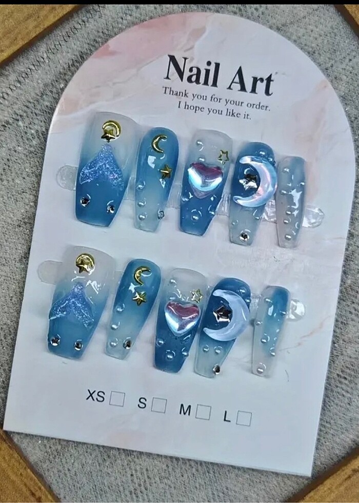 Ürün el yapımı jeldir. Setin içerisinde 10 adet tırnak, 1 adet törpü, 1 adet düzeltme çubuğu ve 24 adet yapışkan mevcuttur .