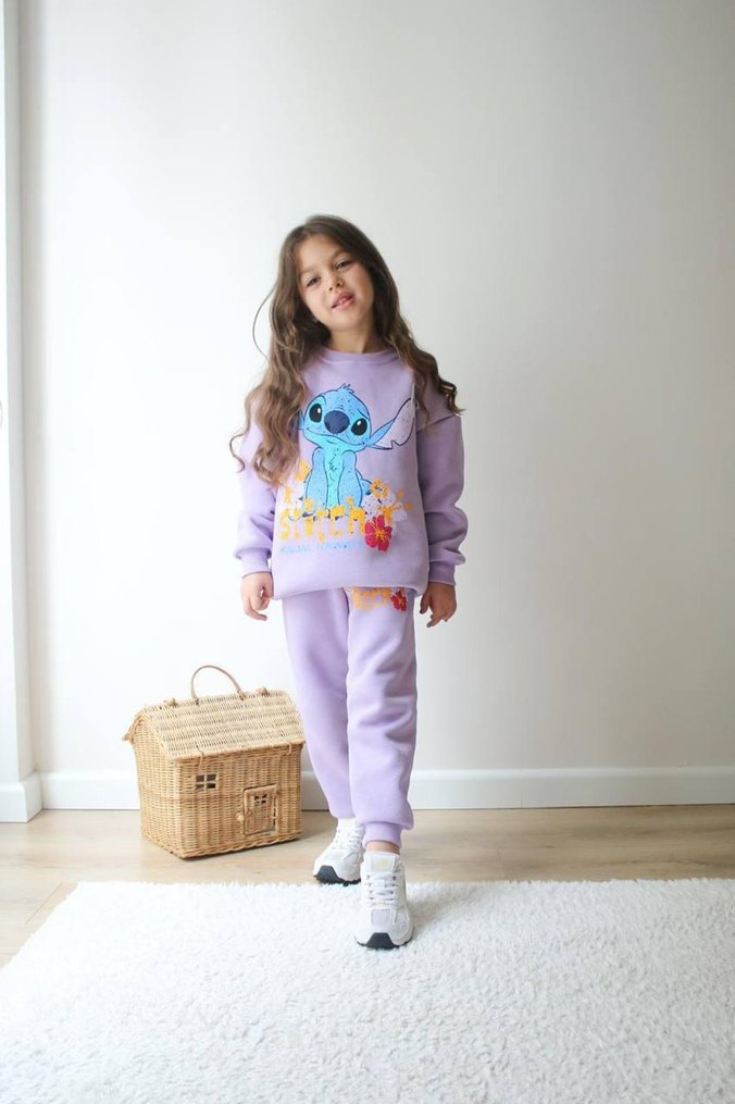 Pastel mor renkli, uzun kollu ve bisiklet yaka kız eşofman takımı. Yumuşak, örme dokulu polar kumaştan, bağlamalı desenli ve karakter baskılıdır. Trend sokak stili için uygundur.