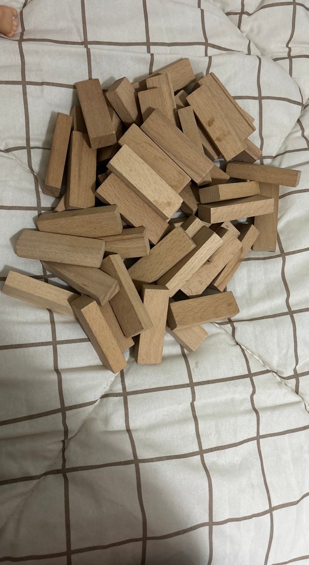 Parlak bej renkte, pürüzsüz kenarlı ahşap oyuncak bloklar. Doğal ahşap dokusu dokunsal oyun için uygundur. Orijinal jenga değil 50 adet var.