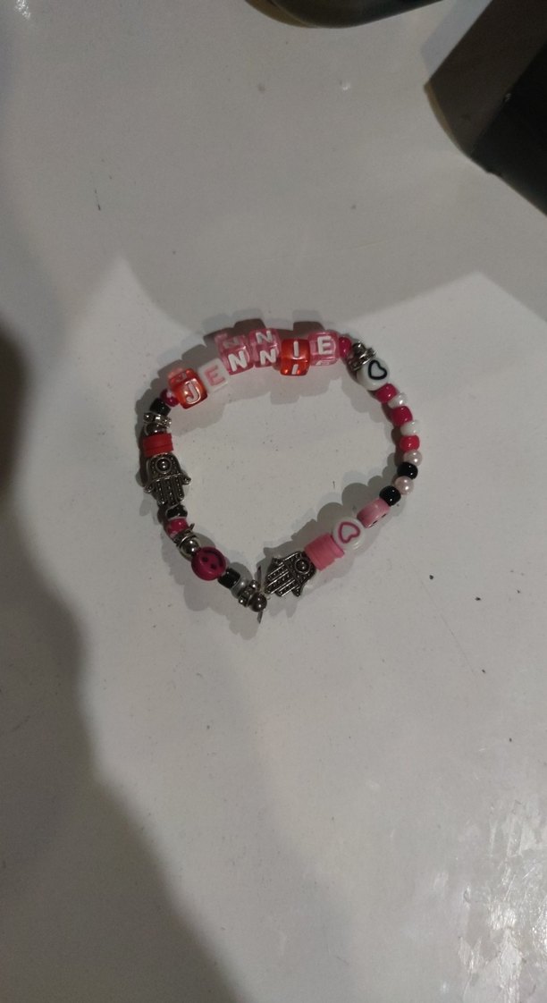 Koyu pembe boncuklardan oluşan,desenli ve blackpink temaya sahip bileklik. kpop sevenler icin ideal.