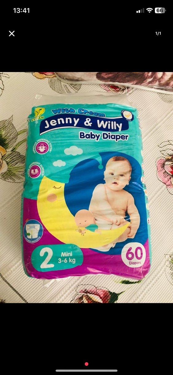 Jenny & Willy Mini bebek bezi, 3-6 kg arası bebekler için 60 adet. Yumuşak ve rahat tasarım, hızlı emicilik sağlar.
