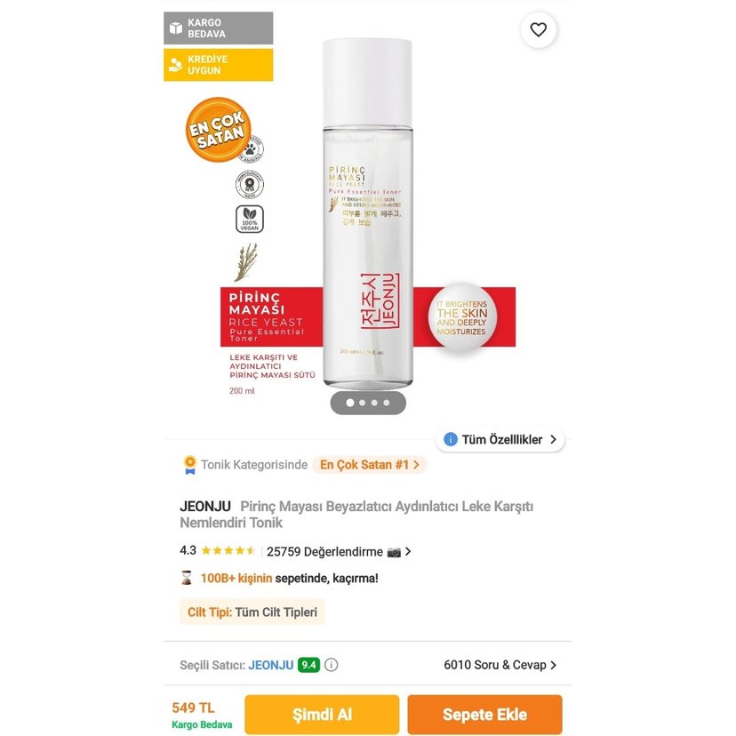 Jeonju Pirinç Mayası içeren, cildi aydınlatan ve leke karşıtı nemlendirici tonik. 200 ml, cildi derinlemesine nemlendirir. İhtiyaç fazlası olduğu için satıyorum