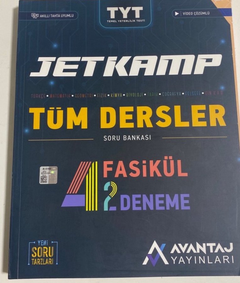 Jetkamp TYT sınavına yönelik tüm dersleri kapsayan 4 fasikül ve 2 denemeden oluşan soru bankasıdır. Video çözümlü ve akıllı tahta uyumludur. Sıfır olup kapağı açılmadı.600 sayfa civarı büyük boy KPSS Ales Dgs içinde uygundur Video çözümlü