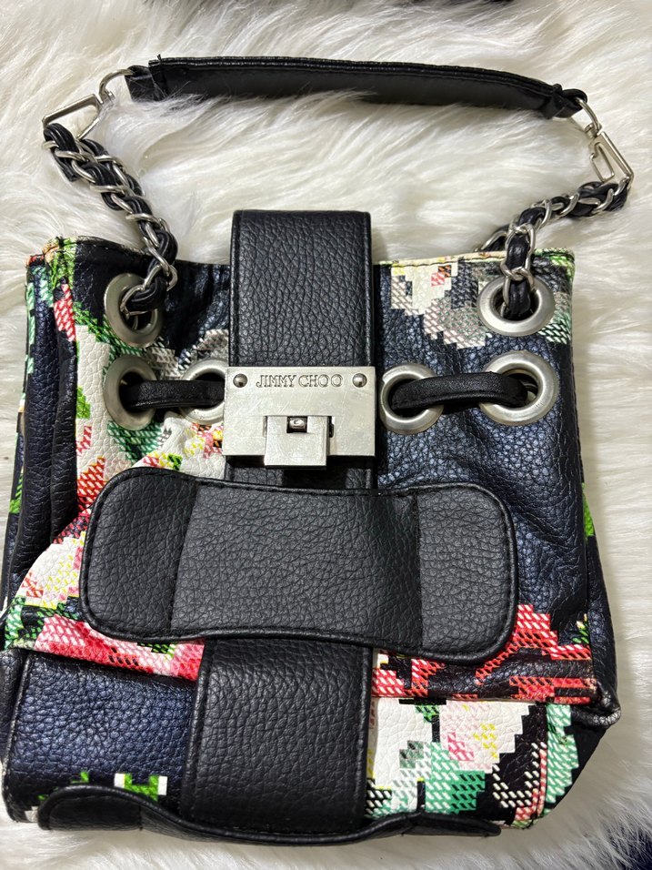 Jimmy Choo marka, çok renkli desenli deri kadın çanta. Tokalı kapama ve koyu renklerle sokak modasına uygun, günlük kullanıma ideal.