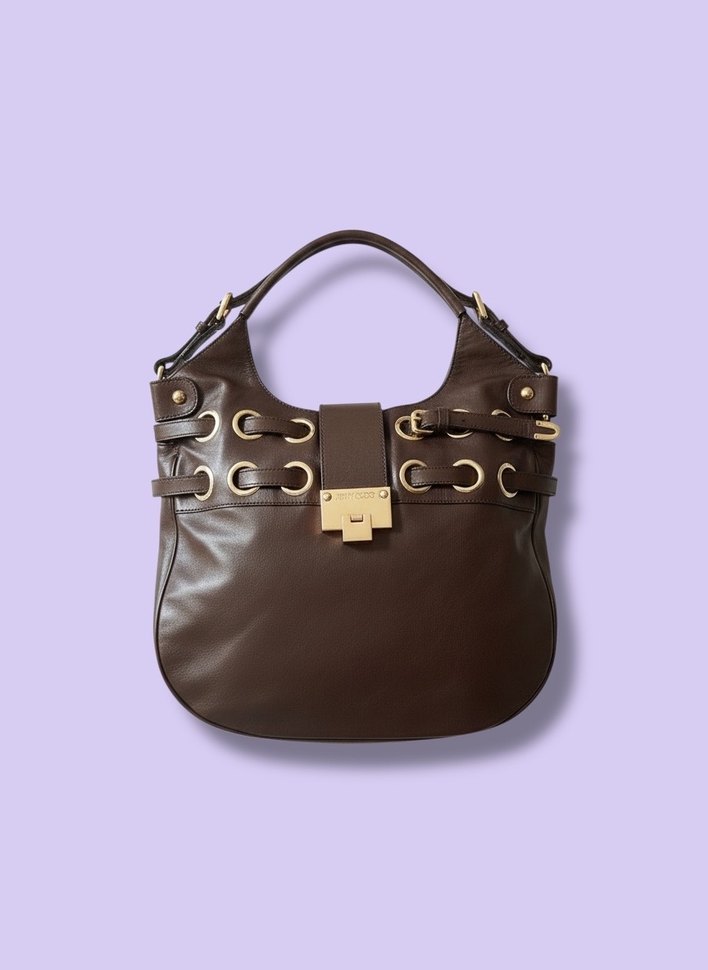 Orijinal Jimmy Choo deri omuz çantası. Zengin kahverengi tonu, altın renk metal tokası ve bağcık detayları ile hem klasik hem iddialı bir modeldir. Yumuşak ve kaliteli derisi sayesinde formunu koruyan, zamansız bir tasarıma sahiptir. Günlük kullanıma uygun geniş iç hacmi vardır. Hem casual hem şık kombinlerle rahatlıkla kullanılabilir. Lüks segment ve koleksiyon değeri olan bir parçadır. Temiz ve özenle kullanılmıştır.