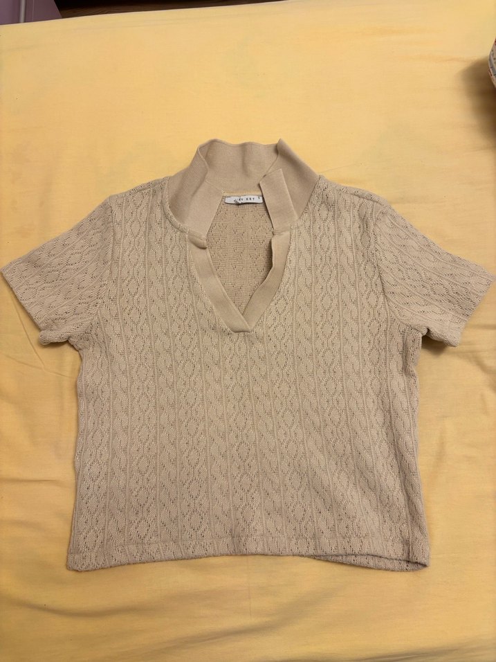 Bej renkli, örgü kumaştan kısa kollu kadın gömlek. Yaka kısmı kollu ve salaş kesim, günlük rahat sokak stili için uygundur.