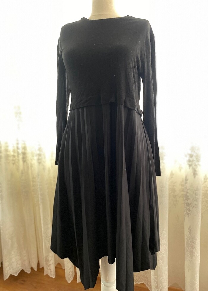 Üstü ince triko siyah piliseli asimetrik kesim tarz elbise