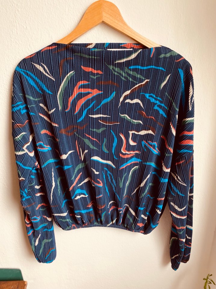 Kadın bluzunda piliseli kumaş ve renkli baskılı desen bulunur. Uzun kollu, kayık yaka ve bol. Temizdir