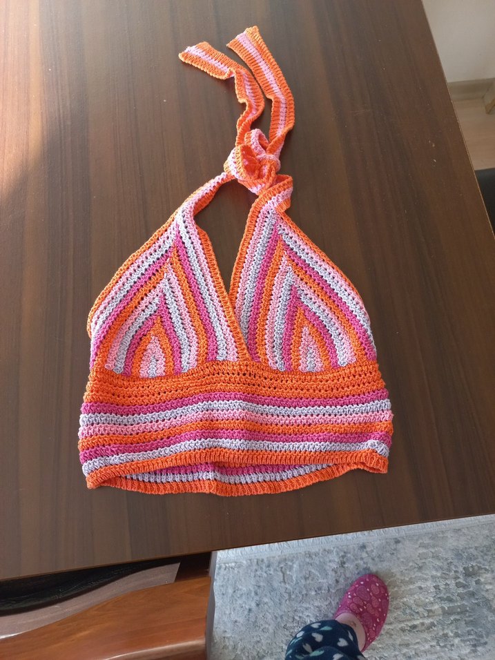 Renkli, bohem tarzda, kısa ve mini uzunlukta bralet. Turuncu, pembe ve mor tonlarında canlı çizgiler ve bağlamalı halter yaka bulunur. M beden.