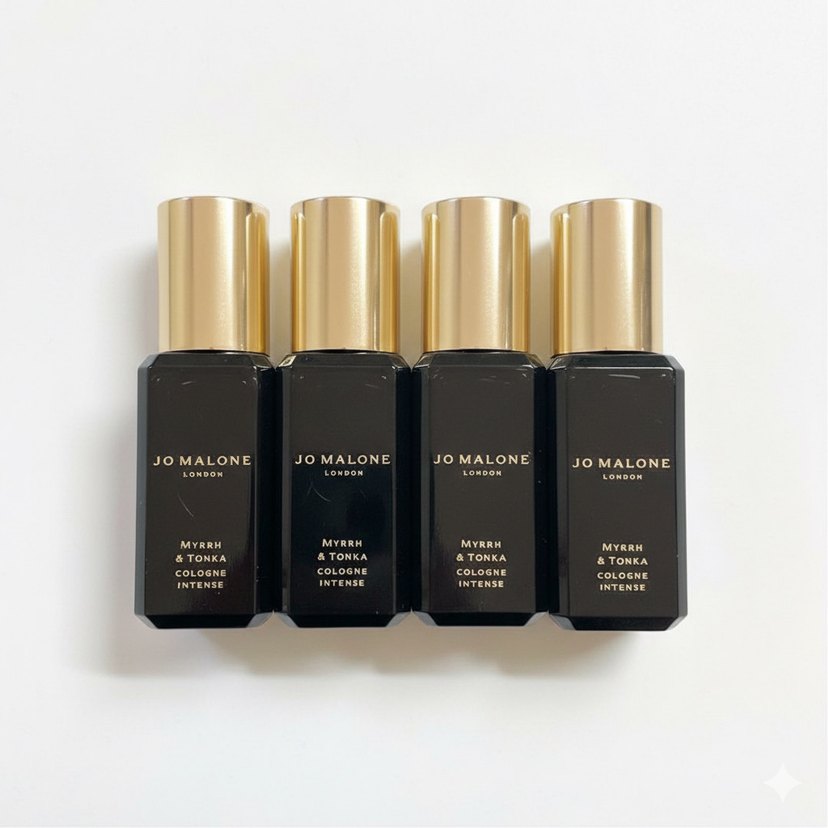 Jo Malone Myrrh & Tonka Intense kadın parfümü, siyah şişelerde altın kapaklı, yoğun koku sunar.