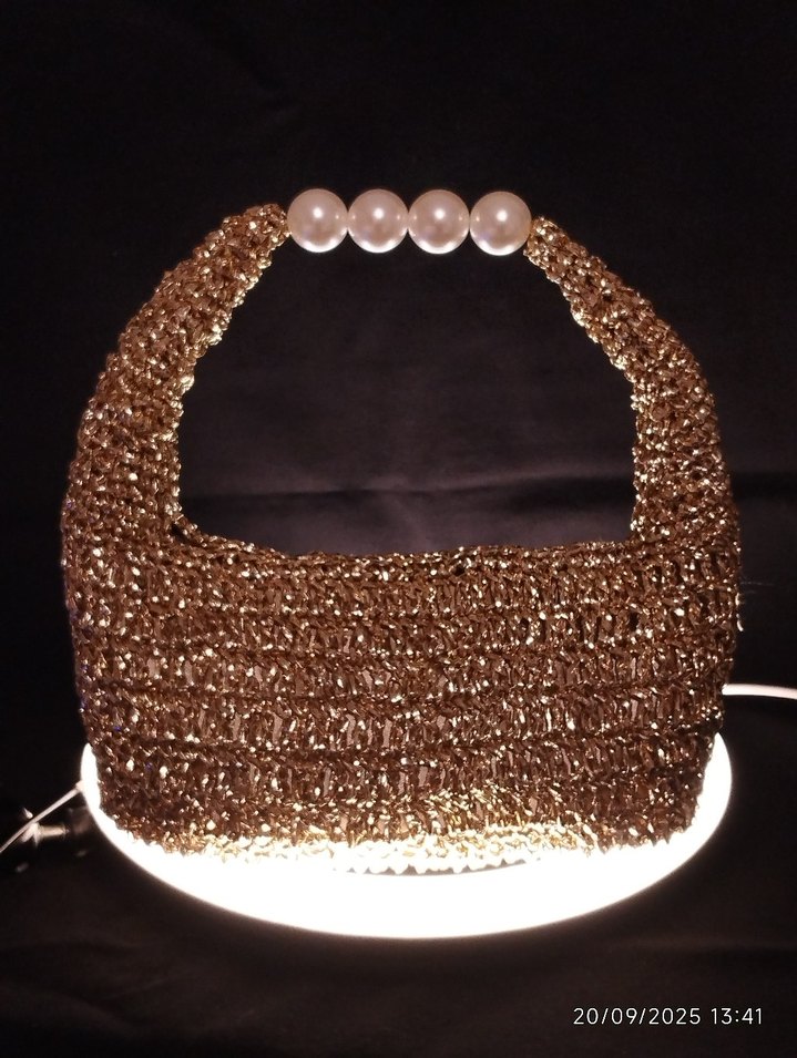 Çantamız Parlak altin renkli metalik ip ile tasarlanmıştır. Kulp kısmında inci görünümlü büyük boncuk detaylarıyla dikkat çekiyor. içi astarlı ve fermuarlıdır. Modern gösterişli ve şık tarzıyla düğünlerin davetlerin özel günlerin en şık tamamlayıcı parçası olan çantamız yıkanabilir ütü istemez. farklı renklerini de siparişle yapıyorum