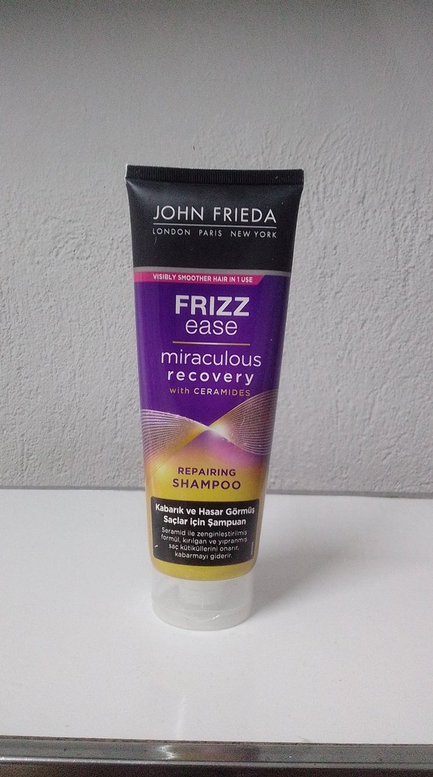 John Frieda Frizz Ease onarıcı şampuan, seramidlerle kalın ve hasar görmüş saçların görünür şekilde düzelmesine yardımcı olur. SON FYAT mktari rsmde gruldugu gbi ambalaj uzeri cizik yazi slnme soyulma var