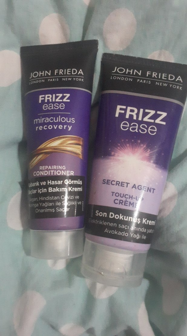 John Frieda Frizz Ease set, hasar görmüş saçlar için onarıcı krem ve avokado yağı içeren elektriklenmeyi önleyen son dokunuş kremi içerir.