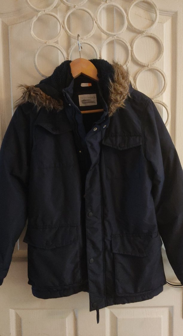 Erkek çocuk için lacivert renkte, yumuşak kumaştan, suni kürk detaylı kapüşonlu ve çıtçıtlı yakalı regular fit kaban. Çok iyi durumda yeni gibi. İçi muflondur.
