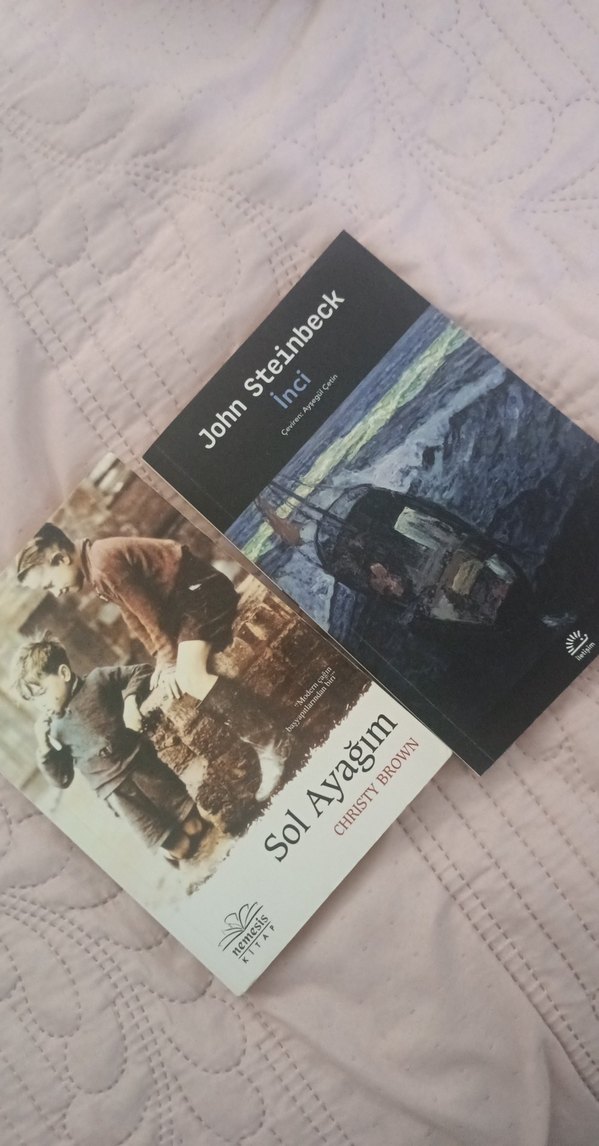 John Steinbeck'in "İnci" ve Christy Brown'un "Sol Ayağım" adlı romanları, görsel kapaklı iki kitap.