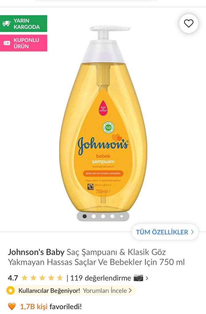 Johnson's Bebek Saç Şampuanı, hassas saçlar ve bebekler için nazikçe temizler. 750 ml pompalı şişede sunulur. + bebek yağı. Kullanılmamış sıfır ürün