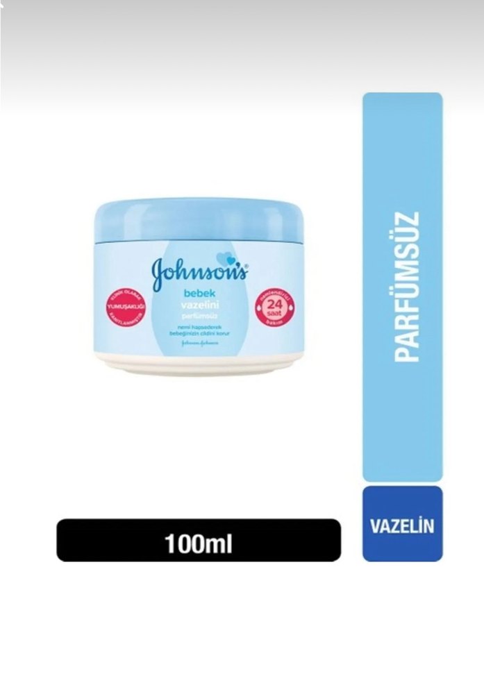 Johnson's bebek vazelini, 100ml ambalajda, parfümsüz, 24 saat nem ve cilt koruması sağlar.