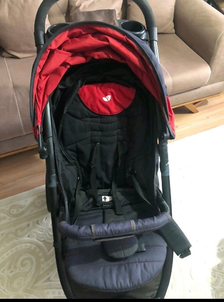 Koyu kırmızı renkte, yumuşak dolgulu oturma yeri ve emniyet kemeri bulunan bebek arabası. Konfor için bardak tutucuları ve koruyucu tente içerir. #kraftbebekarabası #bebekarabası #kraft