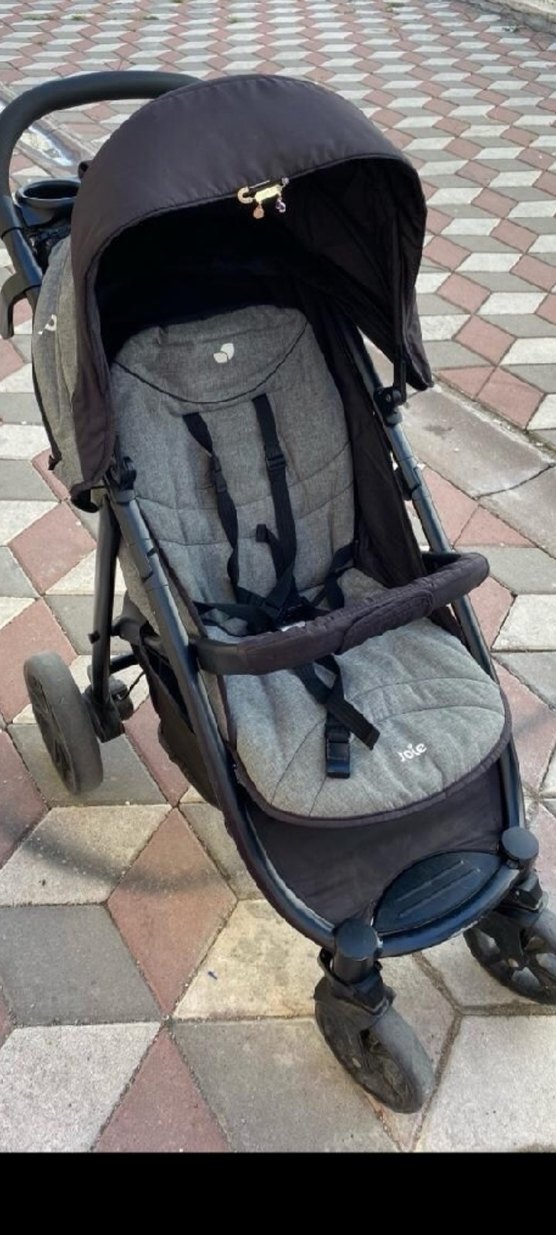 Konforlu dolgulu oturma yeri ve ayarlanabilir güvenlik kemeri olan gri bebek arabası. Dayanıklı çerçeve ve kolay hareket eden tekerlekler içerir.