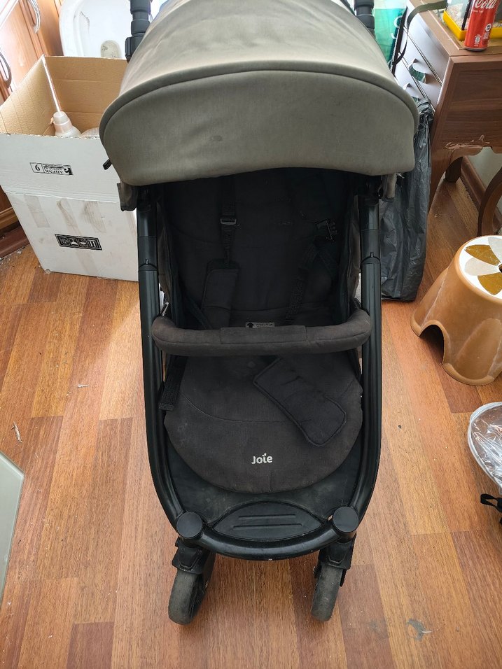 Joie gri renkli bebek arabası, ayarlanabilir emniyet kemeri ve tente ile. Rahat yastıklı oturma alanı ve sağlam iskelet sunar.